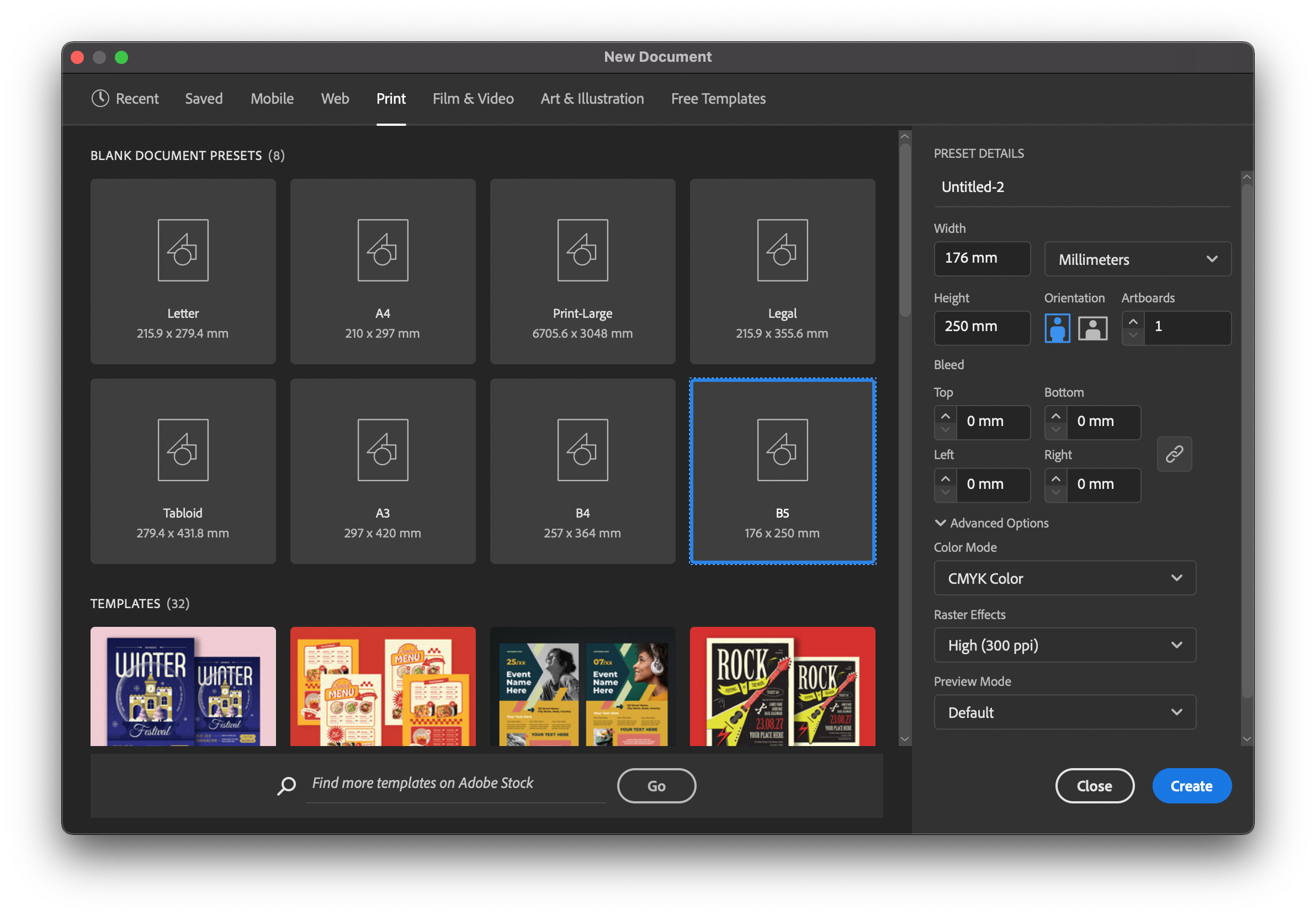 일러스트 새문서 만들기로 B5 사이즈를 보면 176x250mm 로 나온다.