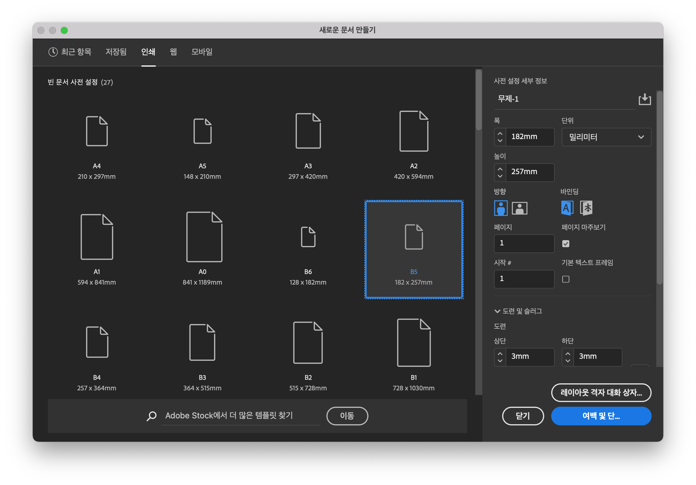 인디자인에서 처음 새로운 문서를 만들때 '인쇄'영역의 B5사이즈를 보면 182 x 257mm로 표기되어있다.
