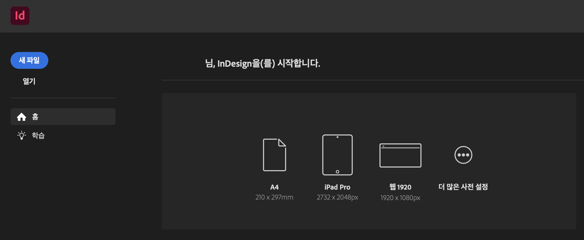 인디자인을 실행 후 새로운 문서를 만들지 않고