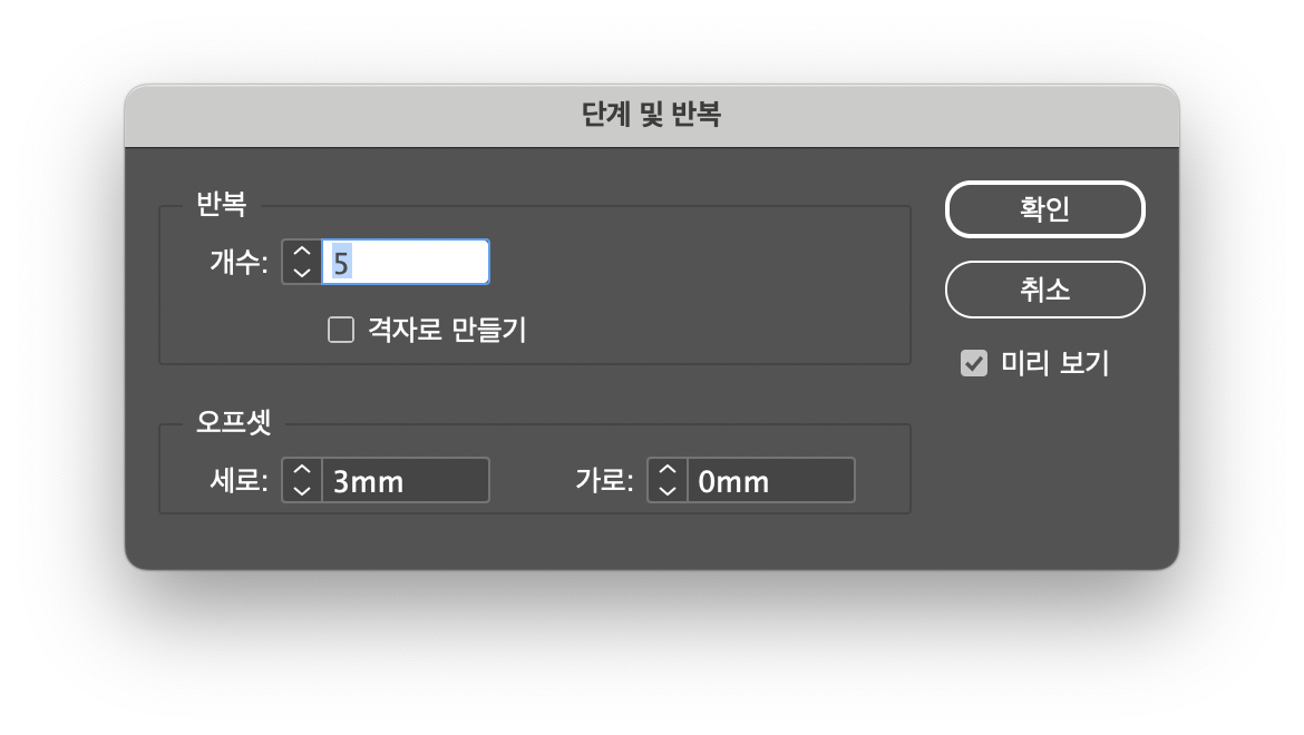 단계 및 반복 창이 뜨는데 복사하고 싶은 개수를 입력하고