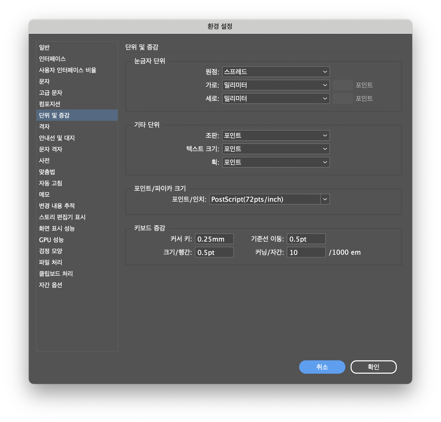 인디자인 단위 및 증감