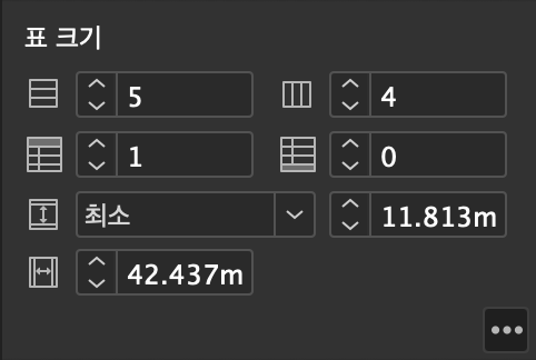 표 패널에서 직접 수치를 입력해서 간격을 조절하거나 마우스로 드래그해서 조절할 수 있다.