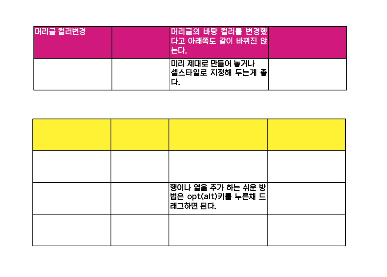 표흘리기를 한 다른 이어지는 표는 머리글이 처음 만들어진 컬러 그대로 유지가 된다.