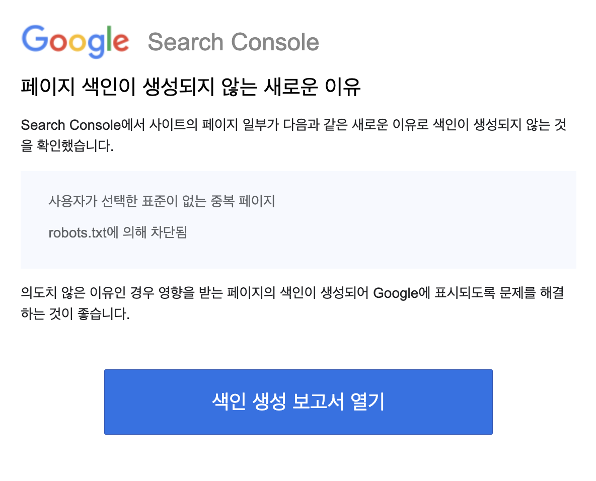 이번에 받은 메일은 새로운 이유로 인해 사이트의 페이지에 대한 색인이 생성되지 않습니다.