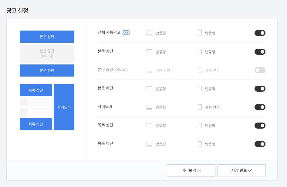 여기서 디테일하게 전체 자동광고, 본문 상당, 본문 하단 등