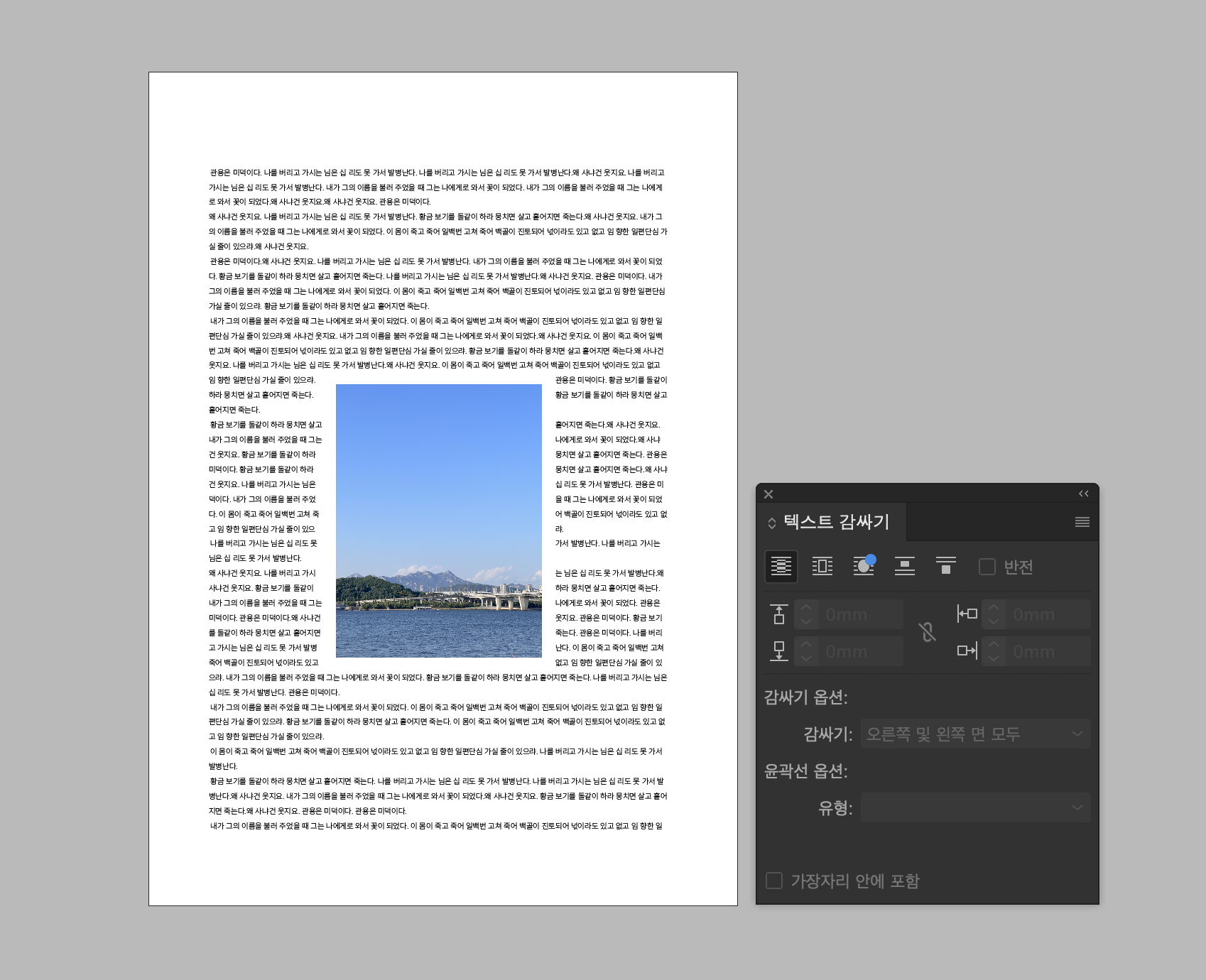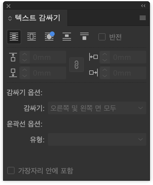 [창]-[텍스트 감싸기] 를 클릭하면 오른쪽과 같이 텍스트 감싸기 패널이 생긴다.