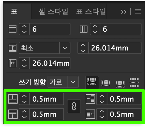 패 패널을 불러오면 인디자인에서 만든 표의 내부 간격 값을 알 수 있다.