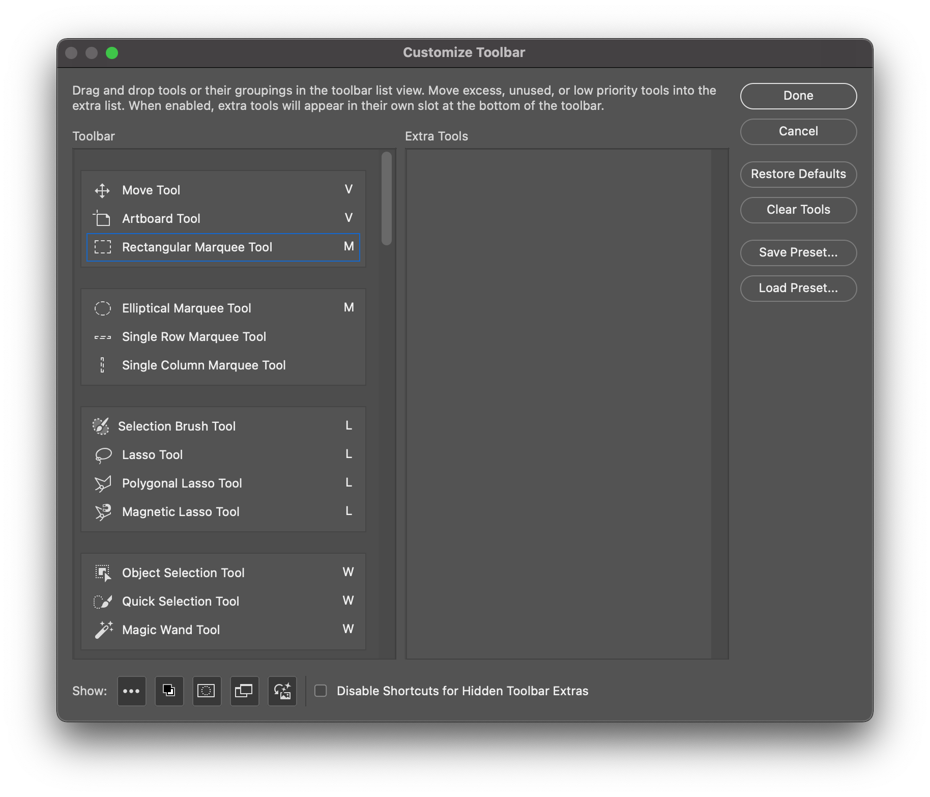 제일 많이 사용하는 툴들의 하나인 사각형 툴이 선택도구 4가지로 묶여 있었는데