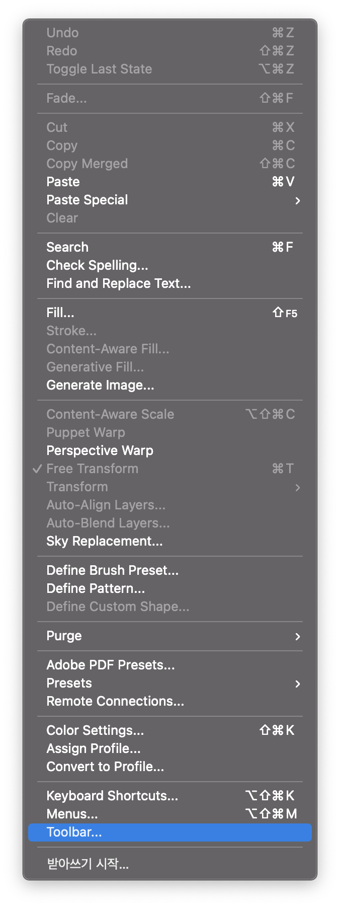 포토샵 메뉴 [edit]-[toolbar]를 클릭하면