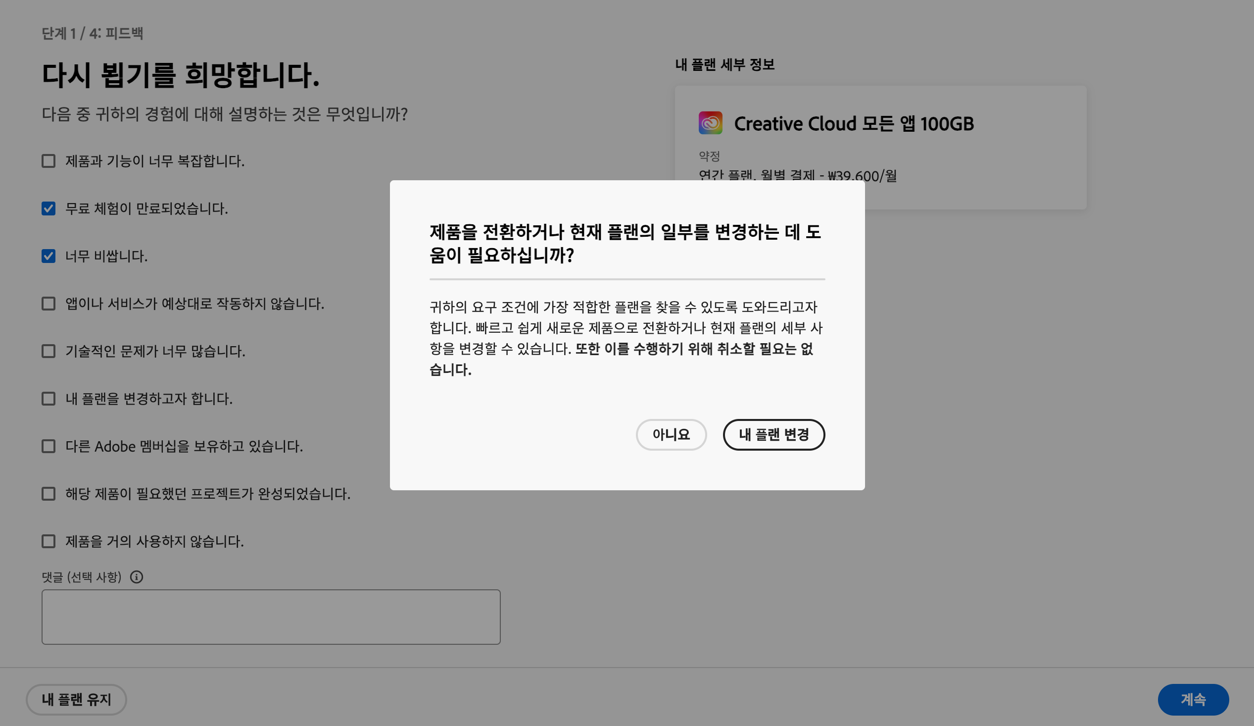 해지할 날짜에 어도비 무료체험 취소를 하기 위해 사이트에 방문을 했더니