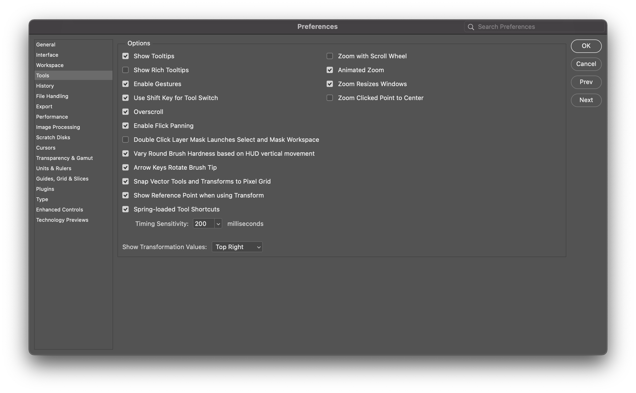 포토샵 환경설정으로 들어가서(cmd+K) 왼쪽 메뉴 중 Tools를 선택한다.
