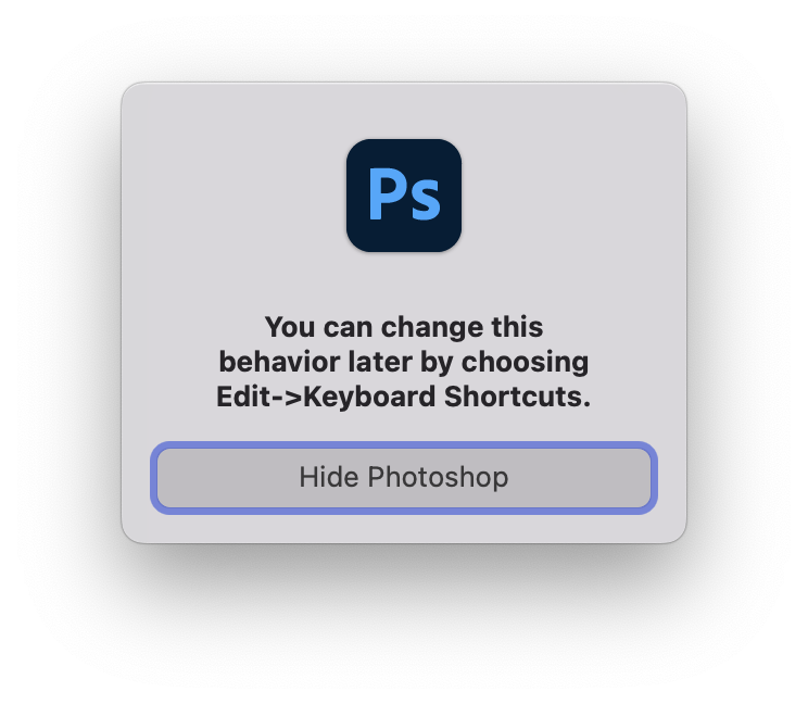 포토샵 설치 후 cmd+H를 누르면 아래와 같은 경고창이 뜬다.