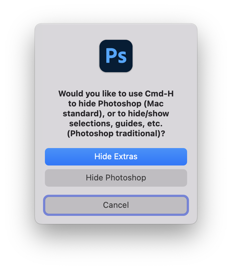 Would you like to use Cmd-H to hide Photoshop (Mac standard), or to hide/show selections, guides, etc.