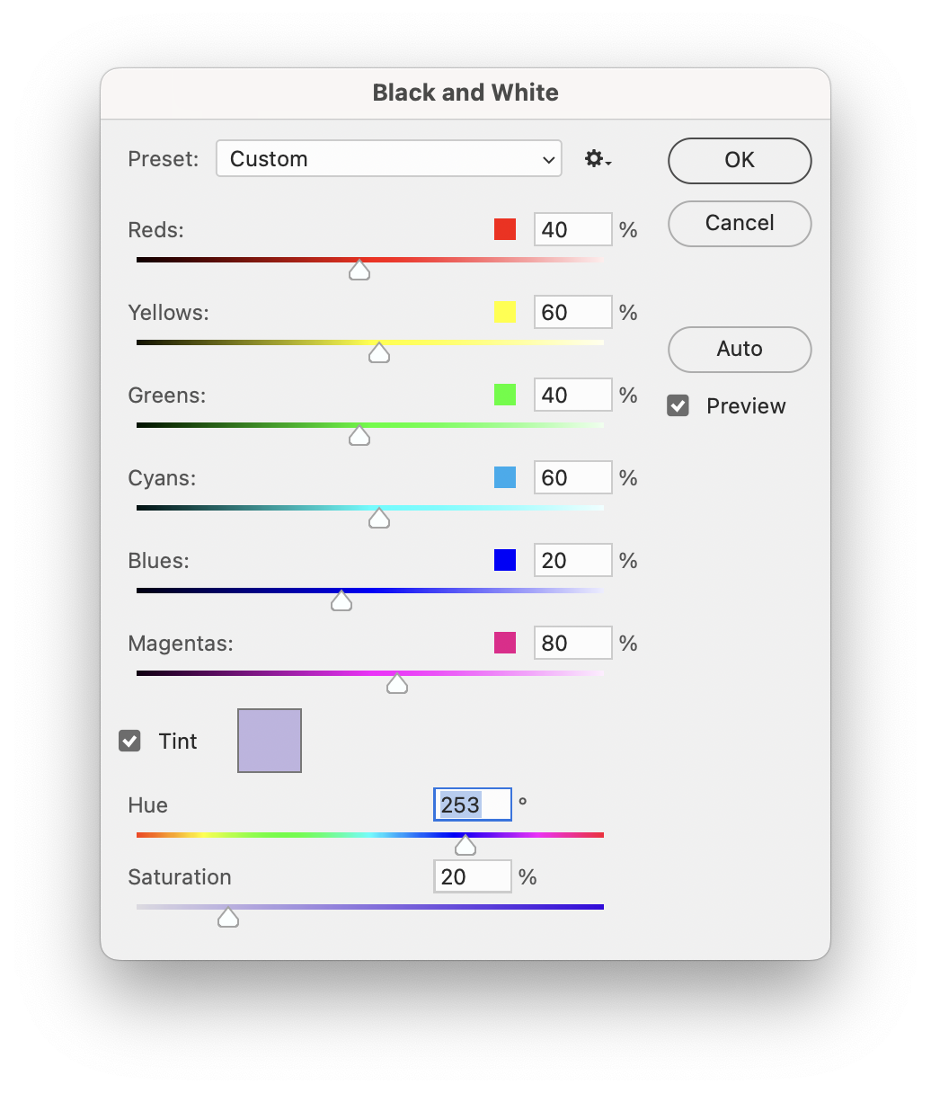 아래쪽에 있는 tint를 체크해주면 흑백으로 만든 이미지에 색상을 추가해서 넣을 수 있다.