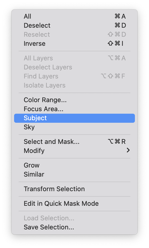 [select]-[subject]를 선택하면 자동으로 배경과 분리된 피사체가 선택이 된다.