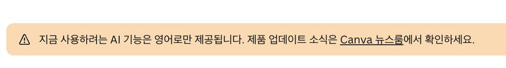 위와 같이 '지금 사용하려는 AI 기능은 영어로만 제공됩니다. 제품 업데이트 소식은 Canva 뉴스룸에서 확인하세요.'라고 뜨길래