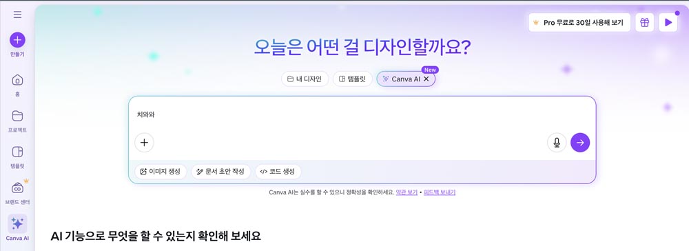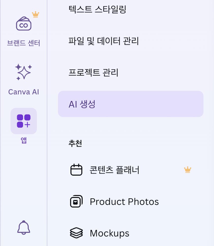 캔바의 좌측 메뉴 중 Canva AI말고 그 아래에 있는