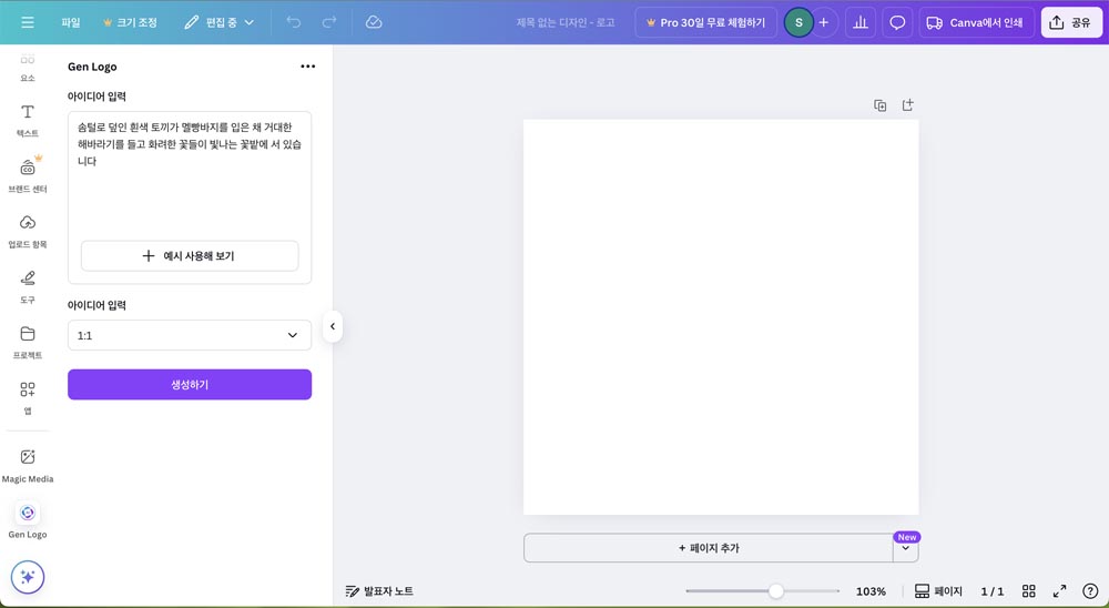다시 메인페이지에 있는 이미지 생성기에서 똑같은 방법으로 한글 프롬프트를 입력하고 로고를 만들어 달라고 요청을 해봤다.