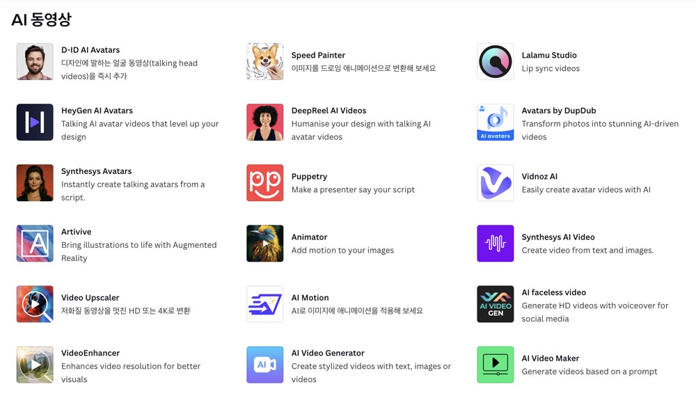 AI동영상, AI이미지, AI음성 등 다양한 템플릿이 많이 있다.