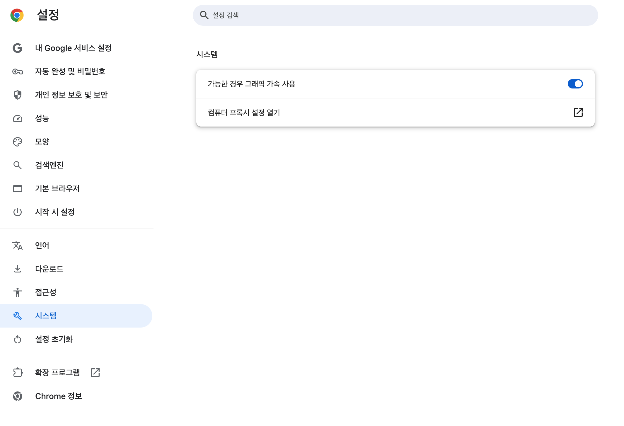 그럼 다시 '가능한 경우 그래픽 가속 사용'설정을 켜주자!