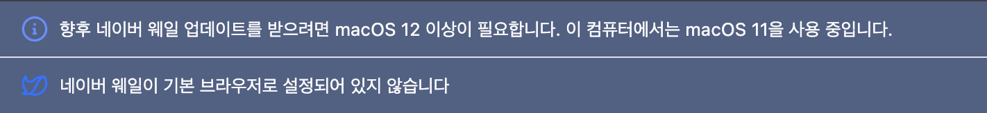 향후 네이버 웨일 업데이트를 받으려면 macOS 12 이상이 필요하다고 한다!