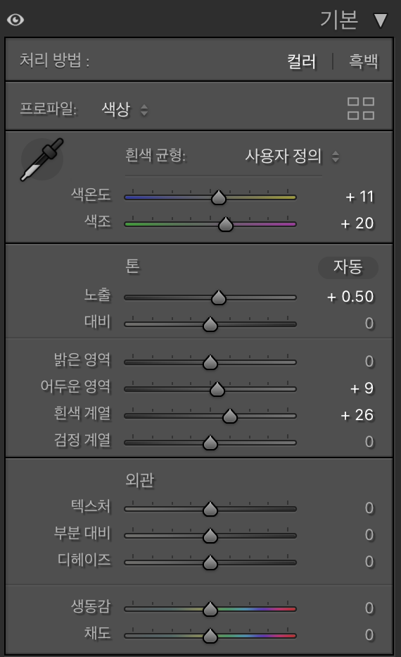 라이트룸에서 기본으로 설정되어 있는 값으로도 클릭한번이면 변경이 가능하다