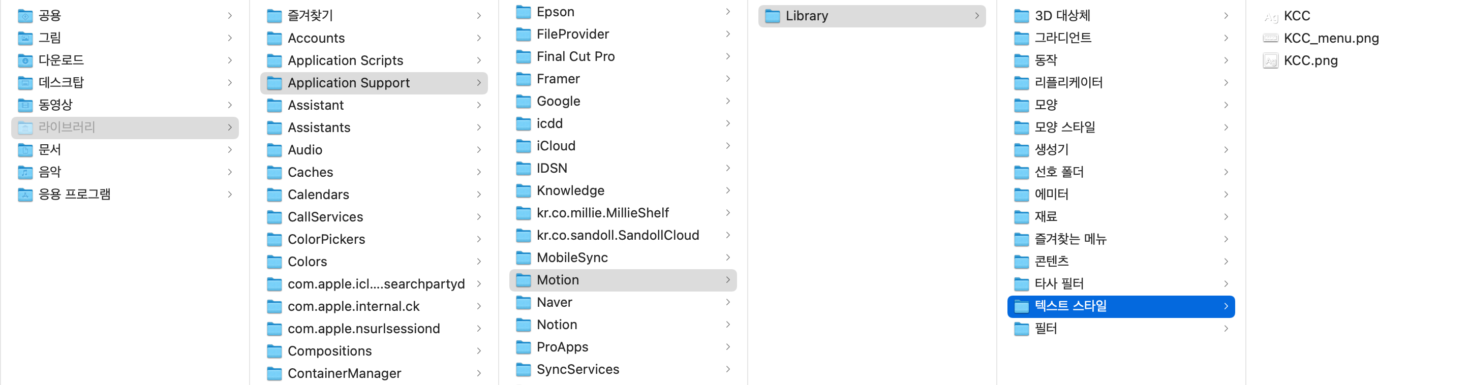 [라이브러리]-[Application Support]-[Motion]-[Library]-[텍스트스타일] 이 경로로 들어가면