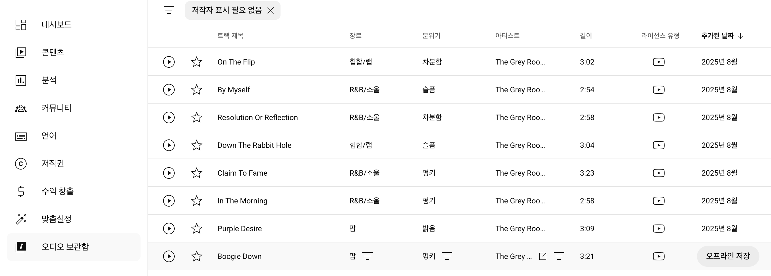 유튜브스튜디오 오디오 보관함 무료음악 듣기