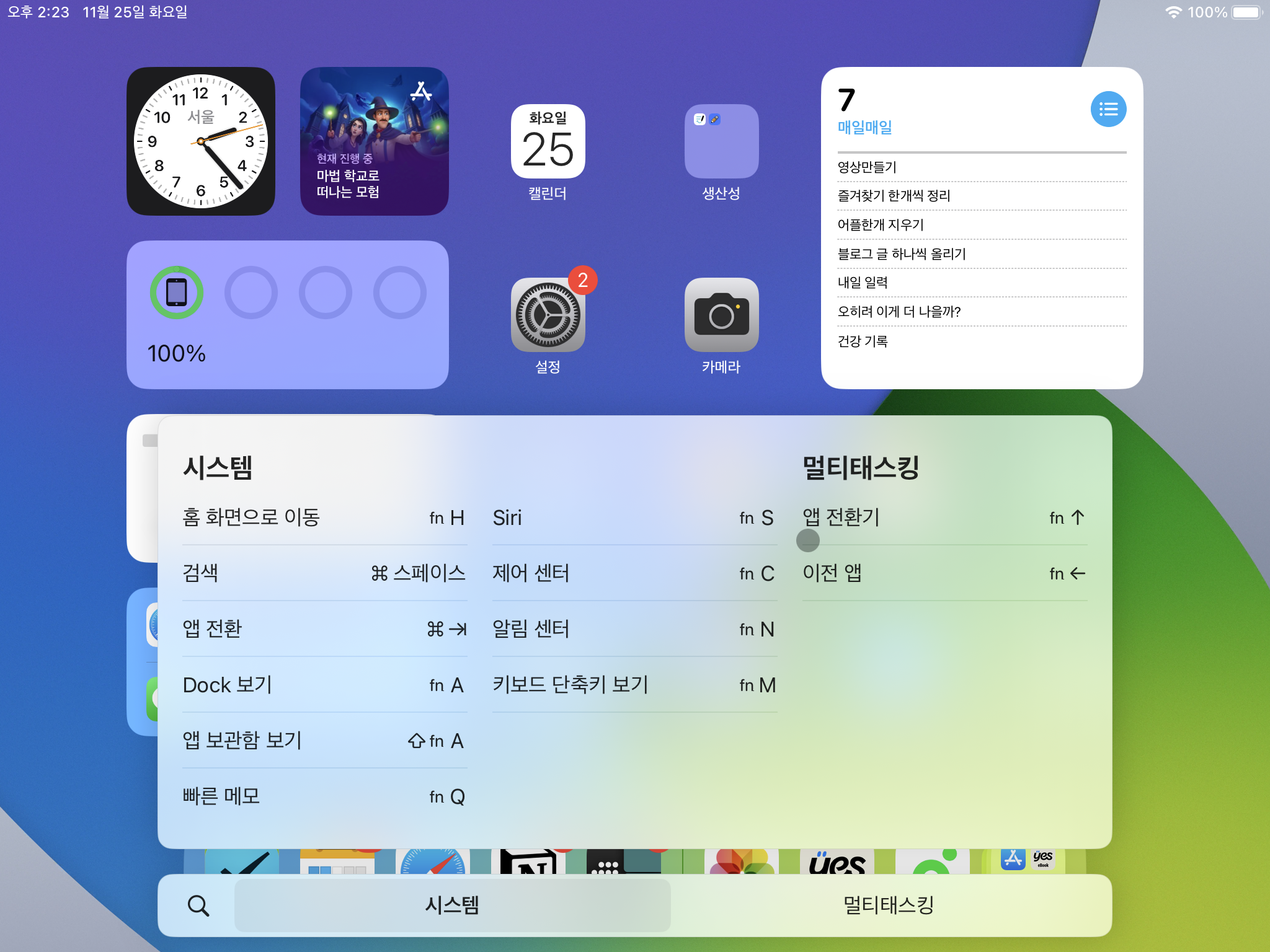 이 화면은 아이패드 사용중 바탕화면에서 나타나는 단축키와