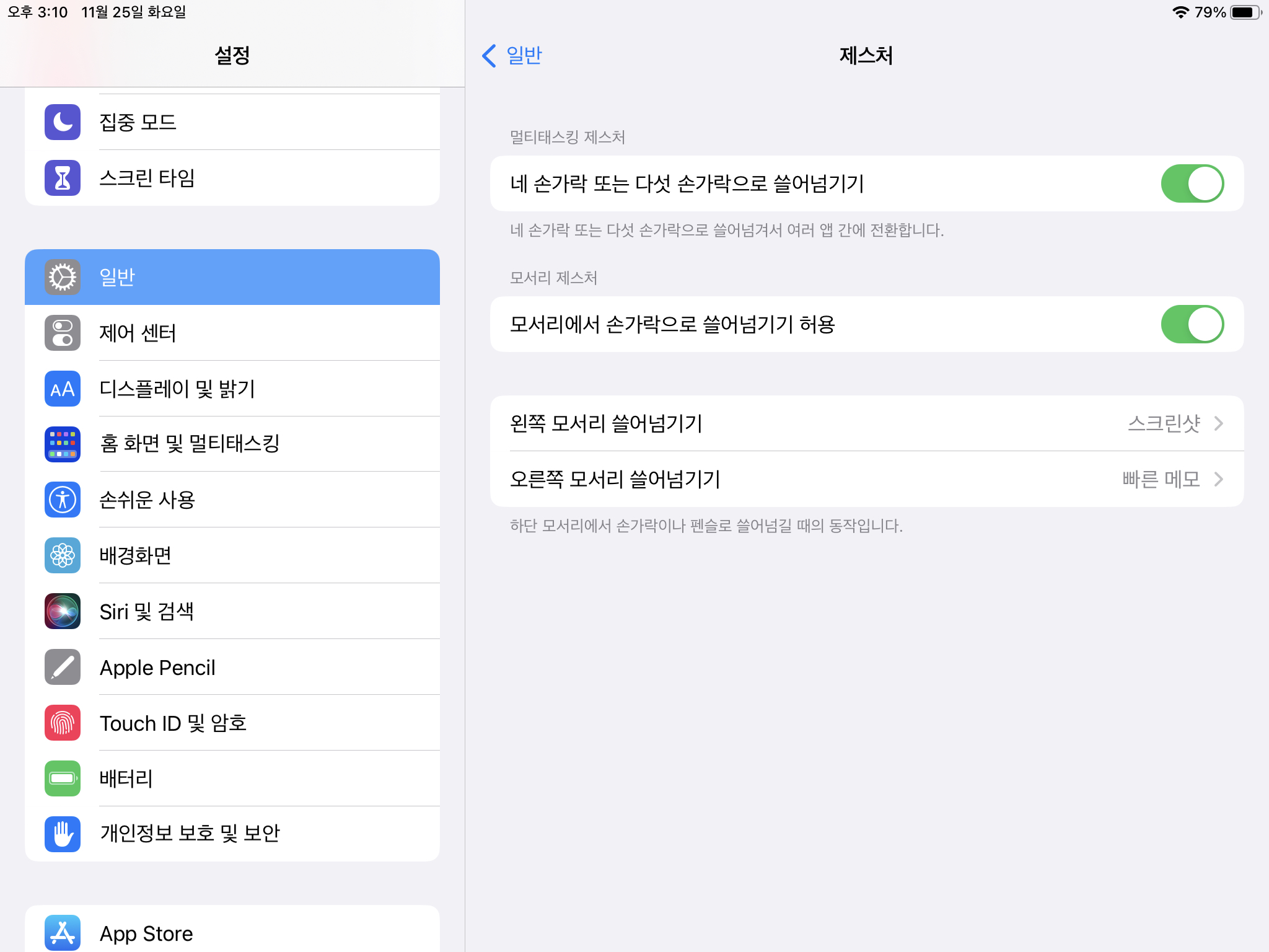 [설정]-[일반]-[제스처]-[모서리에서 손가락으로 쓸어넘기기 허용]을 활성화 해주면 된다.
