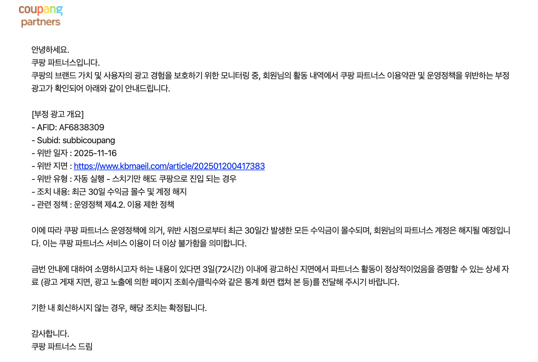 [쿠팡 파트너스] 운영정책 위반 안내 (A-2)
