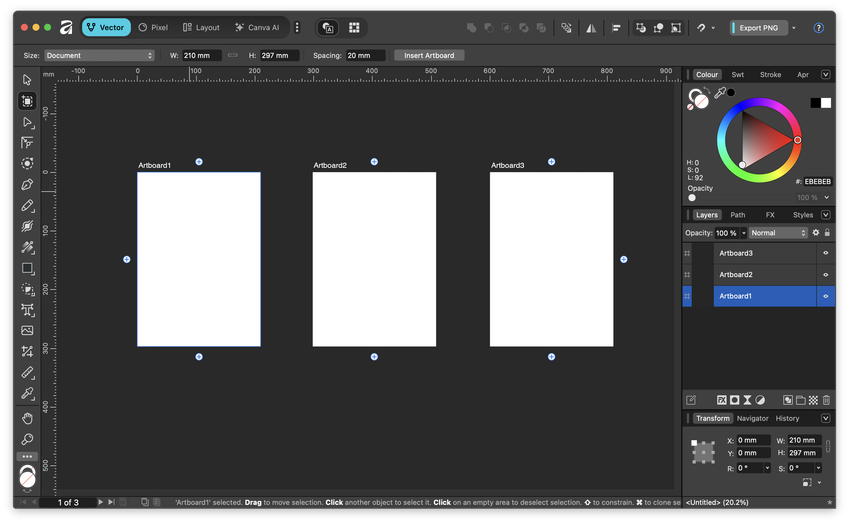 affinity Vector 에서 툴메뉴 2번째에 있는 아트보드 아이콘을 선택하게 되면