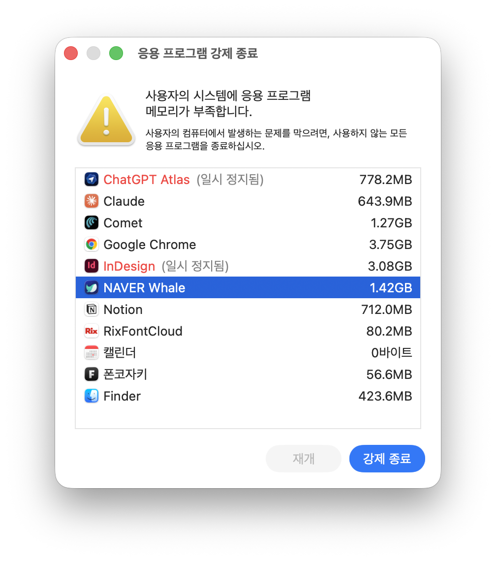 사파리랑 크롬 브라우저가 3G 이상씩 메모리를 잡아 먹는구나!