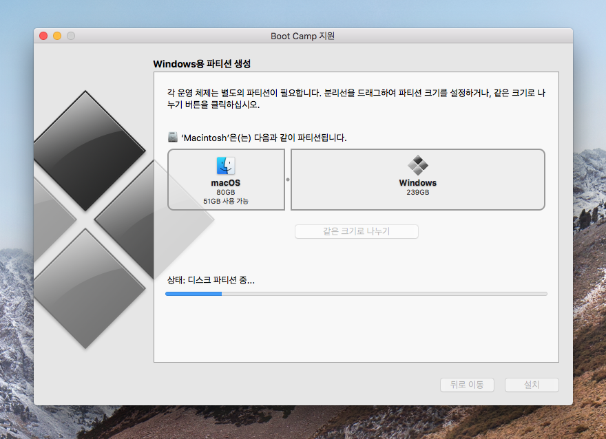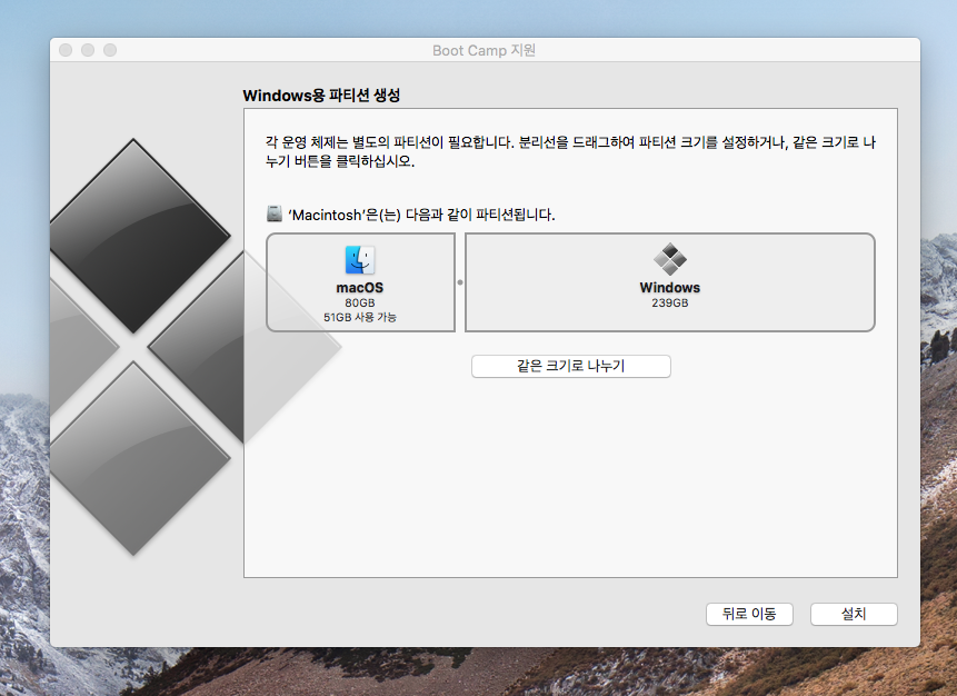윈도우와 맥을 어떻게 파티션을 나눌것인지 용량을 정해주고 '설치'를 클릭해준다.