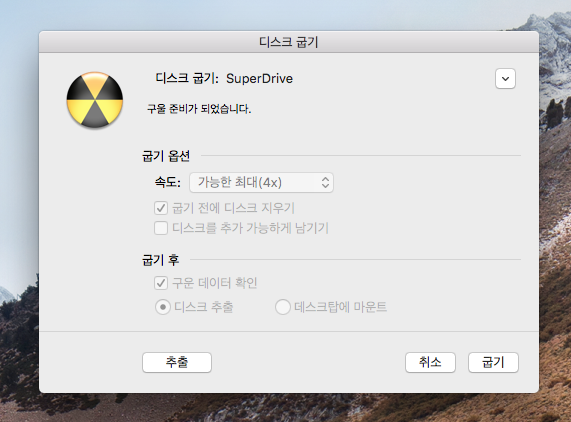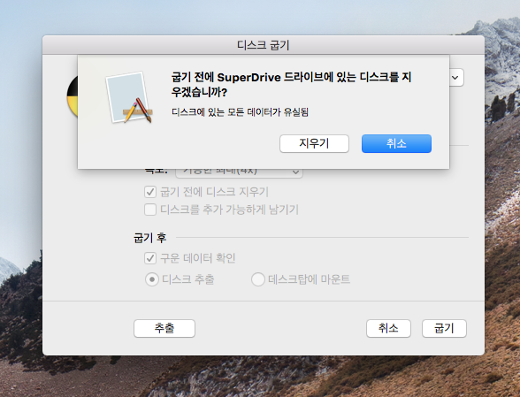 굽기 전에 superDrive 드라이브에 있는 디스크를 지우겠습니까?