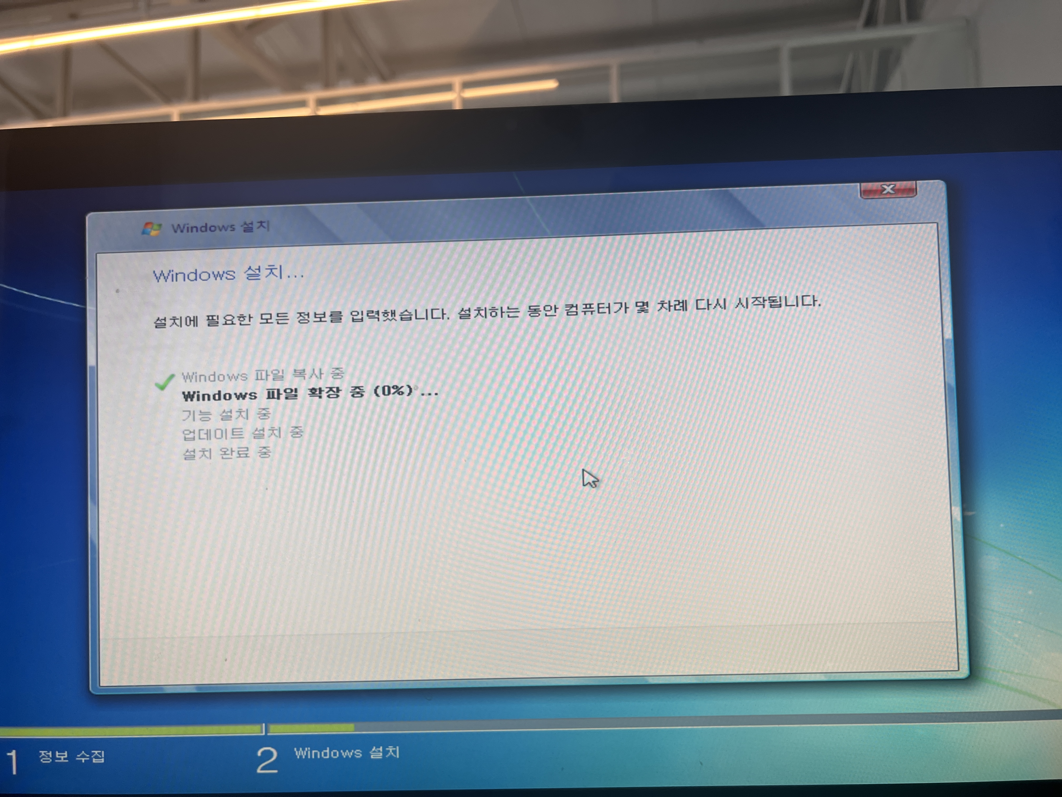 씨디 읽는 소리가 이상하게 나더니.. 더 이상 진행이 안되서.. 다시 윈도우 설치씨디를 다시 만들어줬다.