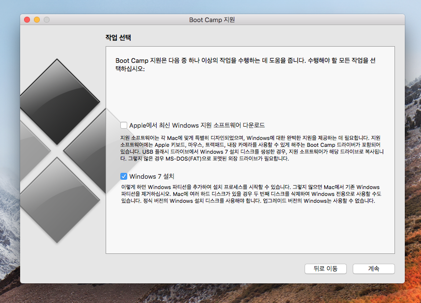 먼저 아래쪽에 있는 'windows7 설치'만 체크하고 '계속'을 클릭한다.